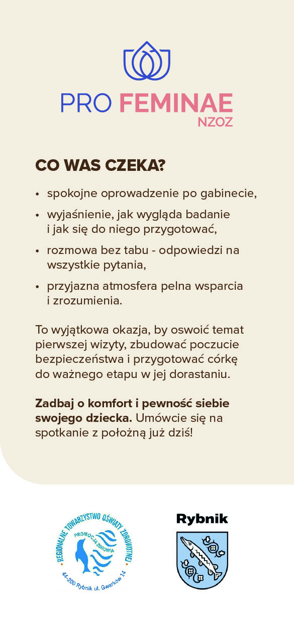 Chętne matki/opiekunowie i dziewczęta będą mogły wziąć udział w warsztatach w gabinecie ginekologicznym w NZOZ PRO FEMINAE S.C. w Rybniku ul. Reymonta 60.