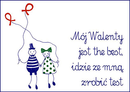 Wykonanie testu w kierunku HIV jest wyrazem troski o zdrowie - zarówno swoje własne, jak i naszego Walentego lub Walentynki. Jednym z elementów walentynek jest wzajemne wręczanie sobie upominków. W związku z tym Krajowe Centrum ds. AIDS przygotowało pocztówkę (do pobrania poniżej) z krótką informacją o testowaniu, którą można wysłać wybranej osobie. Autorką projektu graficznego jest Ida Kwaśnica, uczennica liceum plastycznego w Zielonej Górze, a pomysłodawcą hasła zachęcającego do wykonania testu: Mój Walenty jest the best, idzie ze mną zrobić test jest Kacper Lasota - uczeń gimnazjum w Kwidzynie. Uczniowie ci byli laureatami konkursu zorganizowanego w 2013 r. przez Krajowe Centrum ds. AIDS.
